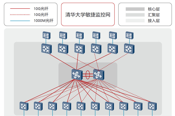 - 清华园网络采用双核双星的分层网络构架,虚拟化集群技术保障核心层稳定可靠,单设备576*10GE的线速端口,确保监控画面流畅传输。