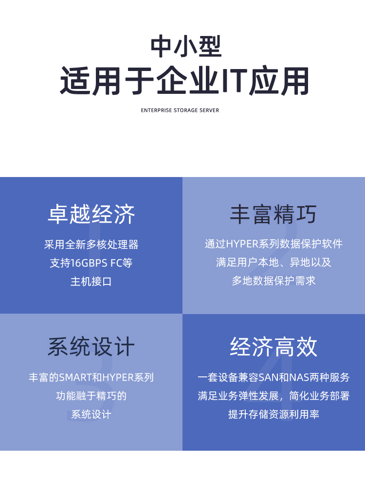 通过Smart系列软件为入门级用户提供更高效的存储资源使用效率,通过Hyper系列数据保护软件满足用户本地、异地以及多地数据保护需求,保障业务连续性和数据可用性。