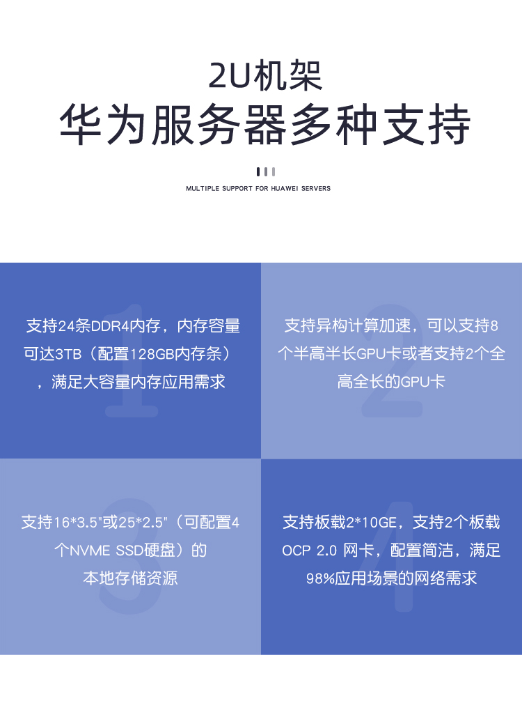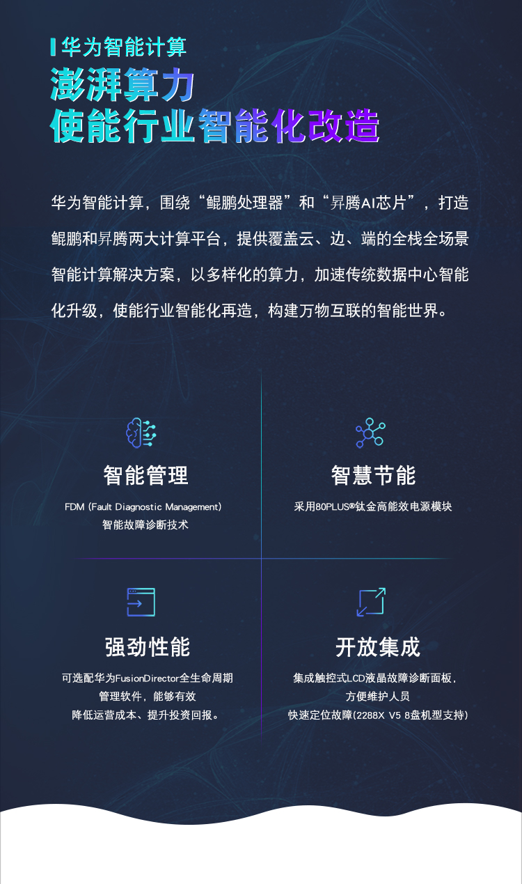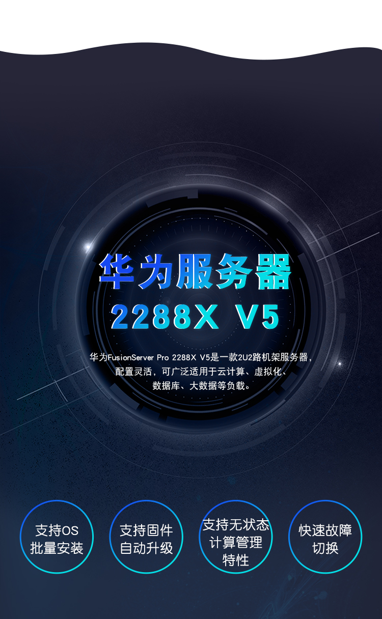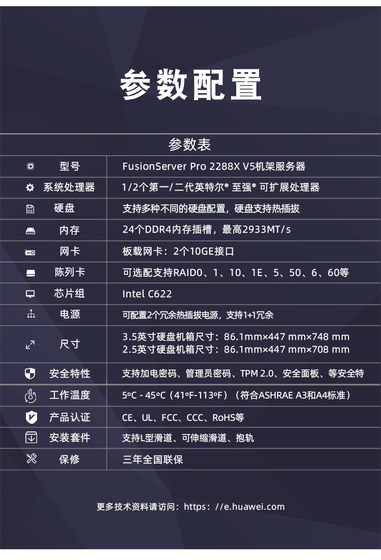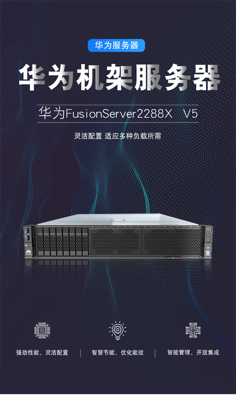 华为FusionServer Pro 2288X V5是一款2U2路机架服务器,配置灵活,可广泛适用于云计算、虚拟化、数据库、大数据等负载。2288X V5可配置2路英特尔®至强®可扩展处理器、24条 DDR4内存、11个 PCIe扩展槽、支持大容量的本地存储资源。集成DEMT智能功耗管理、FDM智能故障管理等专利技术,可选配华为eSight或FusionDirector全生命周期管理软件,能够有效降低运营成本、提升投资回报。