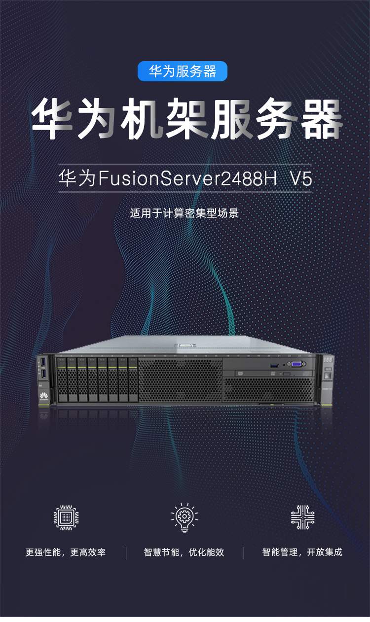 华为FusionServer Pro 2488H V5是一款2U4路机架服务器,适用于虚拟化、高性能计算(HPC)、数据库、SAP HANA等计算密集型场景,相比于2台传统2U2路机架服务器,在虚拟化应用场景中1台2488H V5可以带来约32%的OPEX节省*。2488H V5在2U空间内可配置4个处理器,48条DDR4内存,以及最多25*2.5”的本地存储资源(可配置8个NVMe SSD)。集成DEMT智能功耗管理、FDM智能故障管理等专利技术,可选配华为FusionDirector全生命周期管理软件,能够有效降低运营成本、提升投资回报。