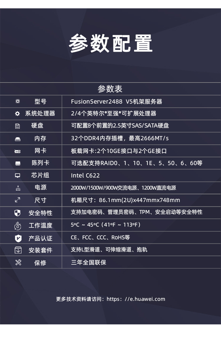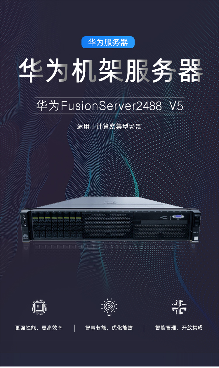 华为FusionServer Pro 2488 V5是最新推出的2U4路机架服务器,适用于虚拟化、高性能计算(HPC)、数据库、SAP HANA等计算密集型场景,相比于2台传统2U2路机架服务器,在虚拟化应用场景中1台2488 V5可以带来约32%的OPEX节省。2488 V5在2U空间内可配置4个处理器,32条DDR4内存,以及最多25*2.5”的本地存储资源(可配置8个NVMe SSD)。集成DEMT智能功耗管理、FDM智能故障管理等专利技术,可选配华为FusionDirector全生命周期管理软件,能够有效降低运营成本、提升投资回报。
