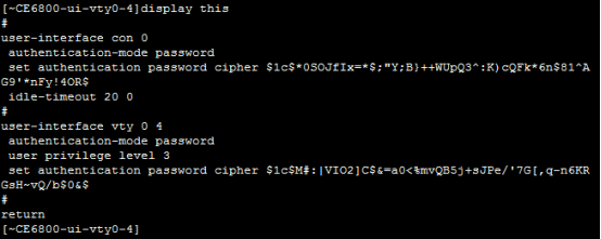 [*CE6800-ui-vty0-4]set authentication password cipher Gauss_234