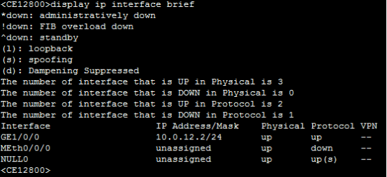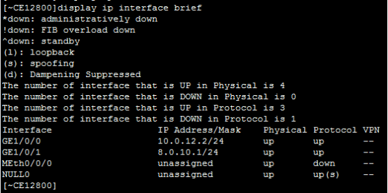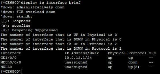 [*CE6800-GE1/0/0]ip address 10.0.12.1 24 配置IP及netmask