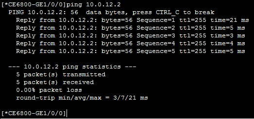 从CE6800 ping 对端CE12800,测试连通性