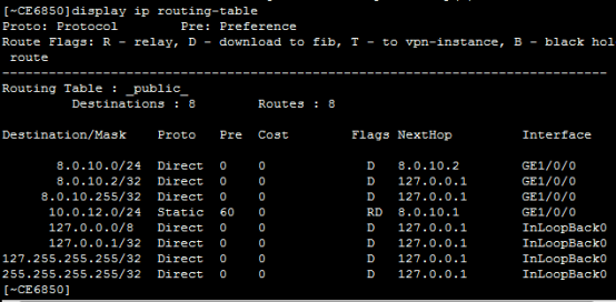 [~CE6850]ip route-static 10.0.12.0 24 8.0.10.1