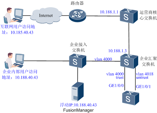 • 运营商网络已接入互联网,用于互联网用户访问FusionManager的公网IP“10.185.40.43”可以被正确路由到运营商核心交换机“10.188.1.1”。