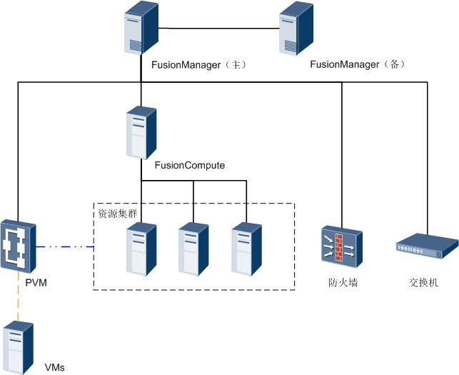 FusionManager采用主备架构,与FusionCompute对接管理虚拟资源,同时管理交换机,防火墙设备。
