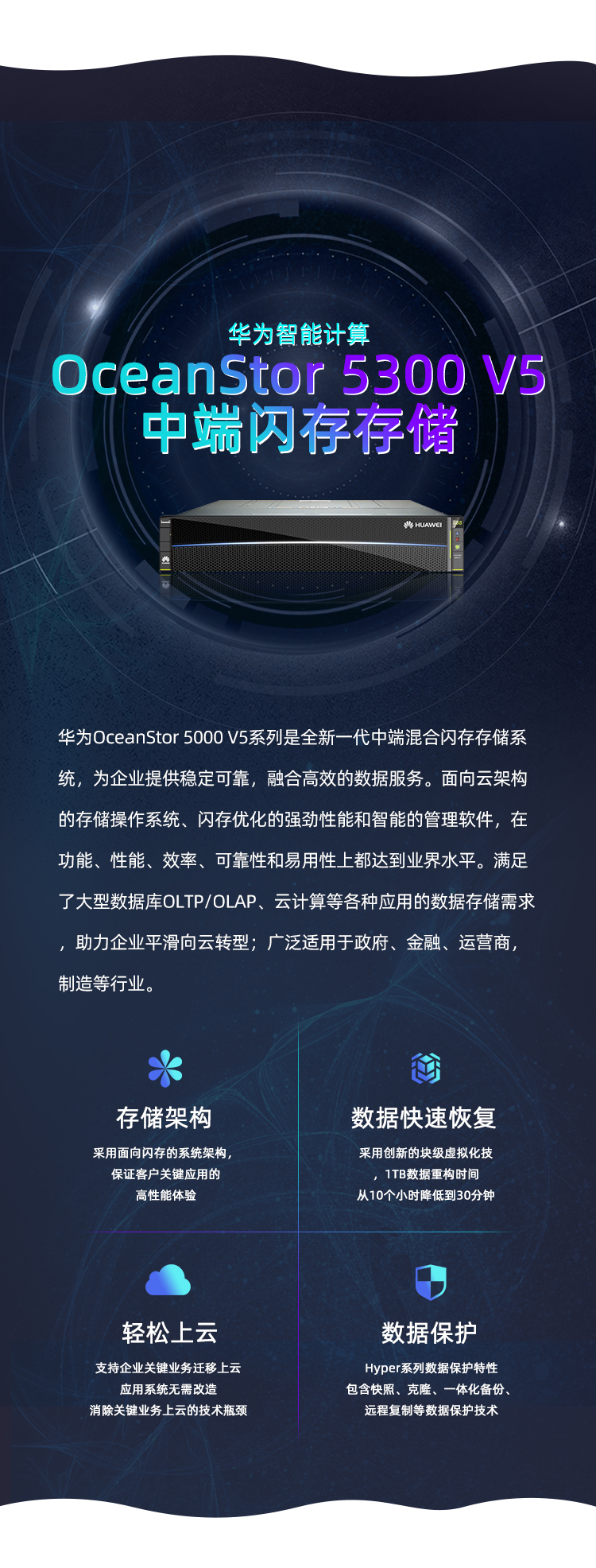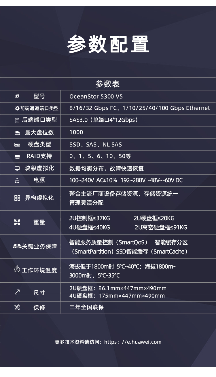 华为OceanStor 5000 V5系列是全新一代中端混合闪存存储系统,为企业提供稳定可靠,融合高效的数据服务。