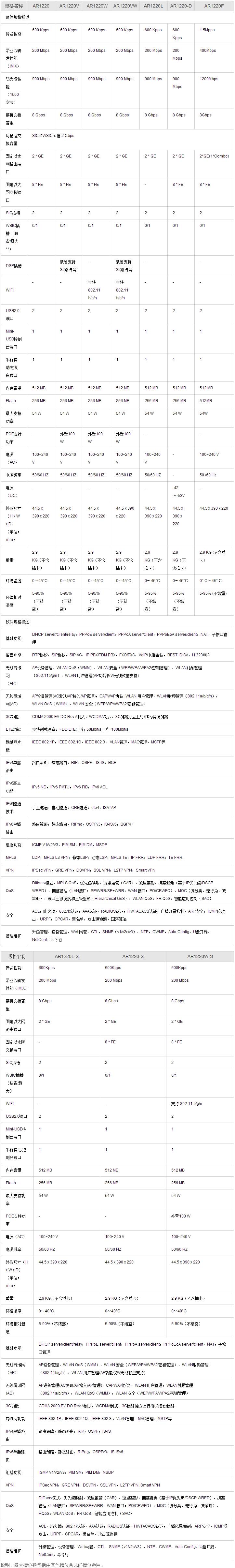 AR1200系列路由器采用嵌入式硬件加密,支持语音的数字信号处理器(DSP)、防火墙、呼叫处理、语音信箱以及应用程序服务,覆盖业界最广泛的有线和无线连接模式,如E1/T1、xDSL、xPON、WiFi、3G、LTE等。AR1220V、AR1220W/AR1220W-S、AR1220VW的百兆固定以太接口还支持PoE功能。