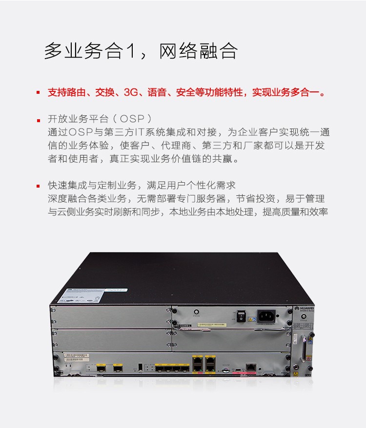 融合路由、交换、3G/LTE、语音、安全等功能特性,实现业务多合一