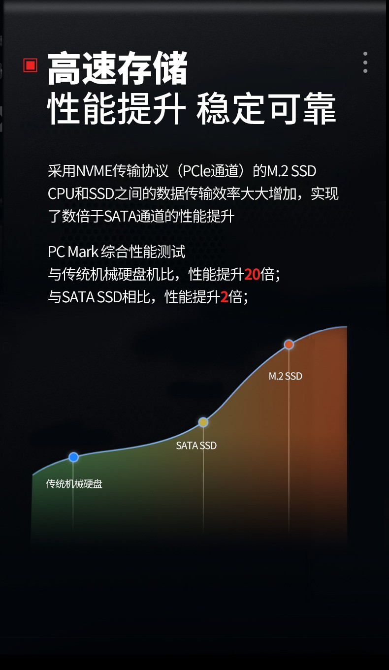 采用NVME传输协议(PCle通道)的M.2 SSD CPU 和 SSD 之间的数据传输效率大大增加, 实现了数倍于 SATA 通道的性能提升