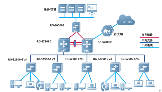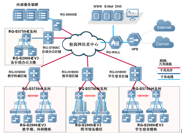 RG-S2900G-E V3系列交换机和楼栋汇聚交换机RG-S5750-H系列,核心区域RG-N18000系列相配合组网,实现千兆到桌面,千兆接入到核心的高性能带宽链路,满足接入用户信息量日益增长的需要。
