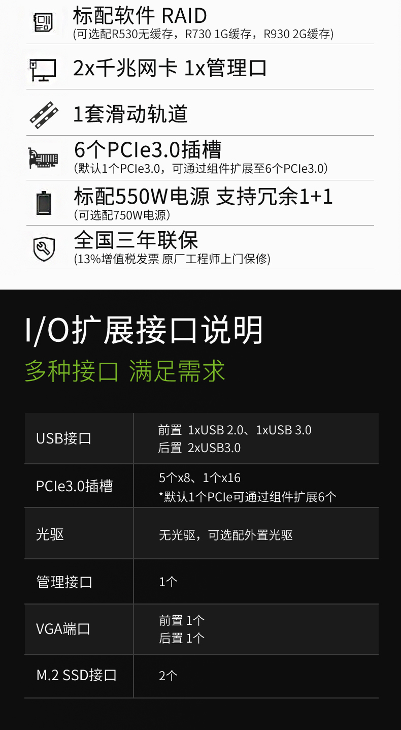 SR588还支持两个内部M.2启动驱动器,可释放其他驱动器托架以获得额外的存储容量。前 USB3.0 端口和可选的前端VGA 简化部署和维修。此外,凭借六个 PCle 插槽和可选1GbE/ 10GbE LOM和NIC的多个选项、80 PLUS Platinum和 Titanium电源,以及45°C温度下持续运行的能力,实现更高灵活性和成本节省。