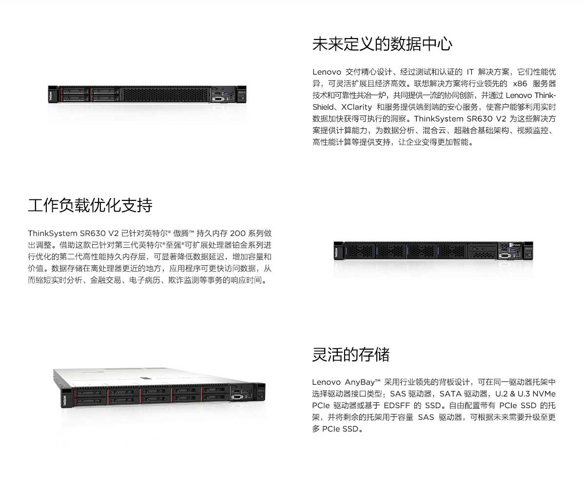 Thinksystem SR630V2已针对英特尔做腾持久内存200系列做出调整。借助这款已针对第三代英特尔至强可扩展处理器铂金系列进优化的第二代高性能持久内存层,可显著降低数据延迟,加容量和价值。数据存储在离处理器更近的地方,应用程序可更快访问数据,从而缩短实时分析、金融交易、电子病历、欺诈监测等事务的响应时。