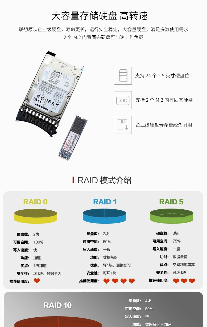 SR650服务器提供基本或高级硬件RAID保护和各种网络选项,包括可选的LOM,ML2和PCIe网络适配器。下一代联想XClarity控制器内置于SR650服务器中,可提供高级服务处理器控制,监控和警报功能。
