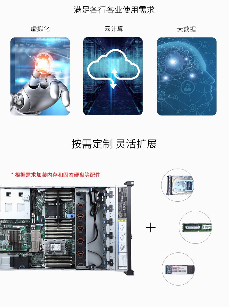联想ThinkSystem SR650是一款理想的双插槽2U机架式服务器,适用于需要业界领先的可靠性,管理和安全性的小型企业,以及化性能和灵活性,以便于未来发展。SR650服务器旨在处理各种工作负载,例如数据库,虚拟化和云计算,虚拟桌面基础架构(VDI),企业应用程序,协作/电子邮件以及业务分析和大数据。