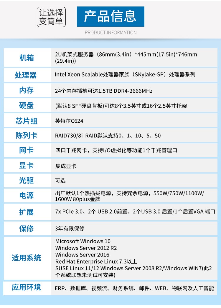 SR658服务器提供基本或高级硬件RAID保护和各种网络选项,包括可选的LOM,ML2和PCIe网络适配器。下一代联想XClarity控制器内置于SR650服务器中,可提供高级服务处理器控制,监控和警报功能。