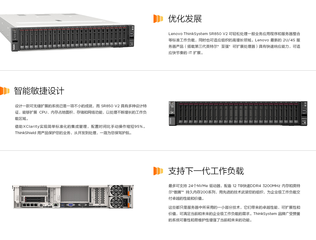 设计一款可无缝扩展的系统已是一项不小的成就,而SR850V2具有多种设计特征,能够扩展CPU、内存占地面积、存储和网络功能,以处理不断增长的工作负载区域。