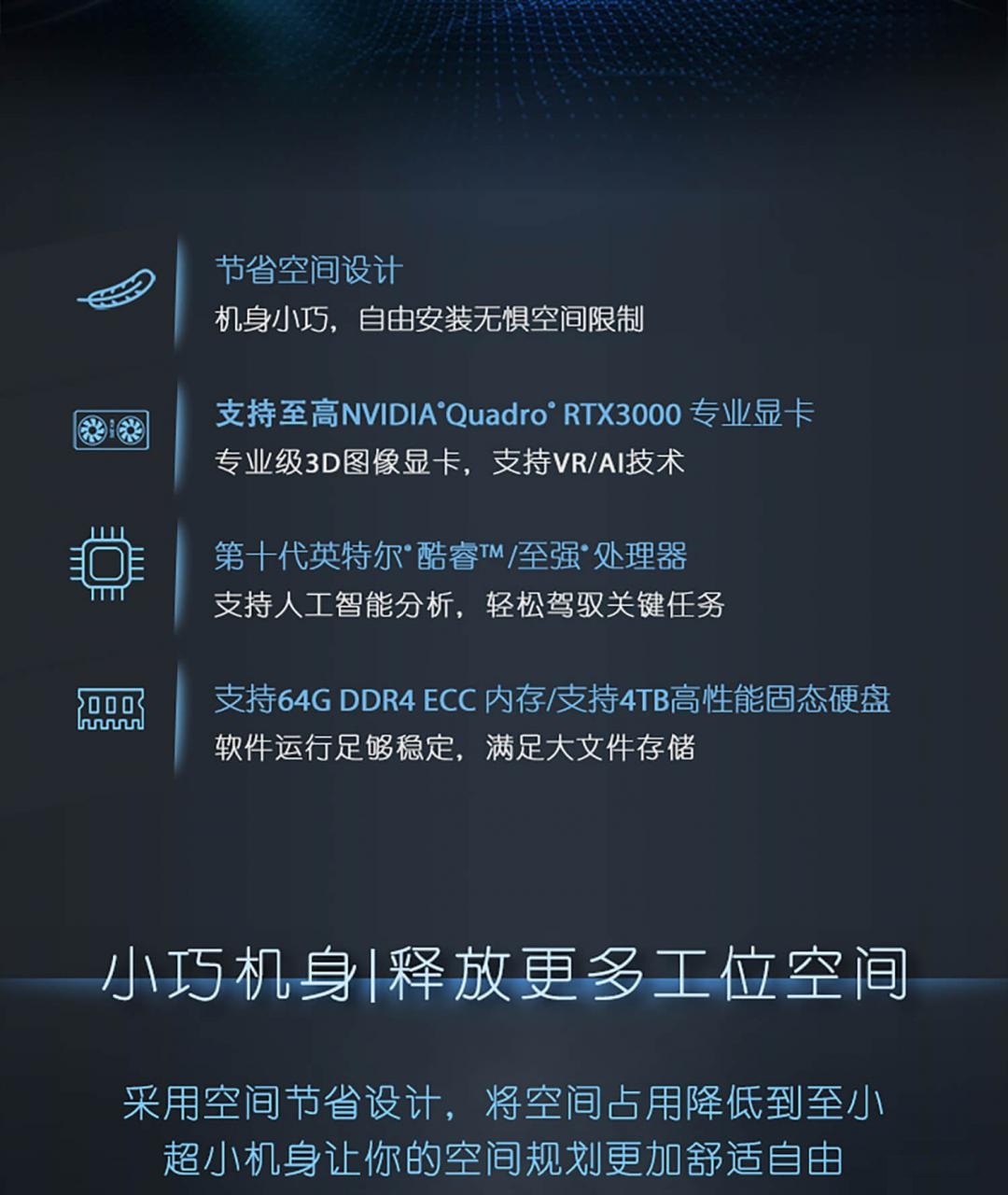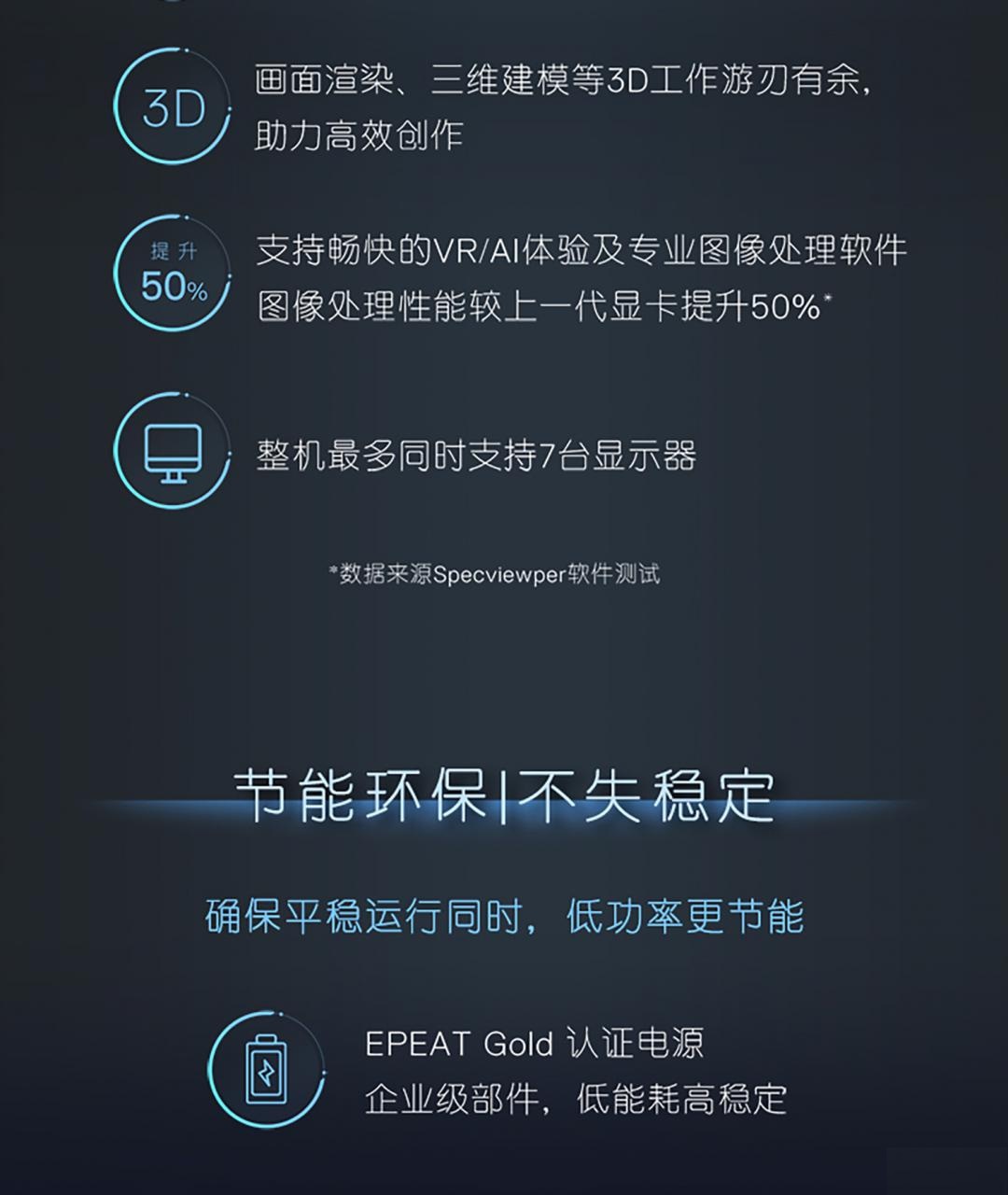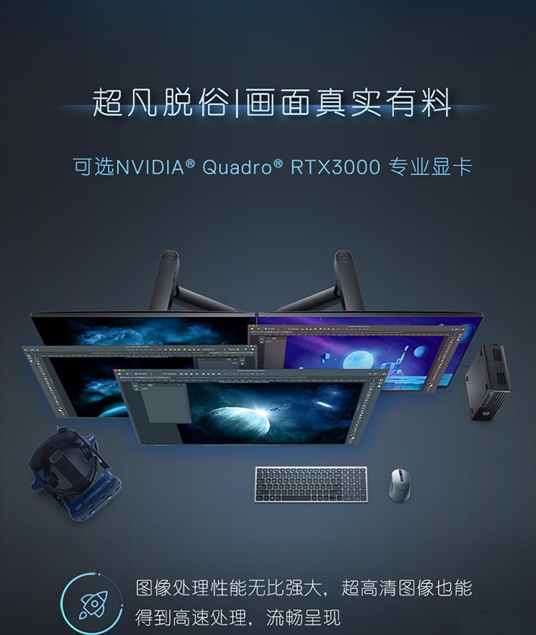 专业显卡:最高可配 NVIDIA® Quadro™ RTX 3000 显卡 (75 W)(即将推出),可选配高达 64 GB 内存(运行速度为 2933 MHz)。